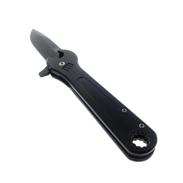 This 7.5" spring-assisted knife features a 2.5" Black blade made of 440 stainless steel and a 5" Black adjustable wrench handle, combining sharp cutting performance with practical tool functionality.