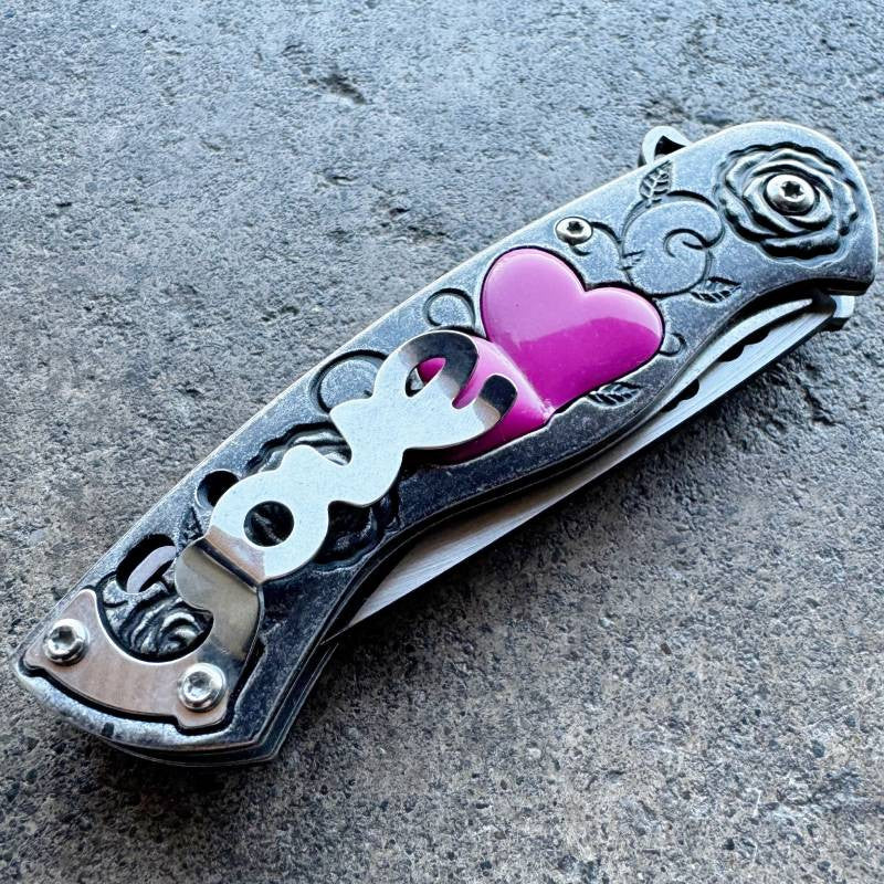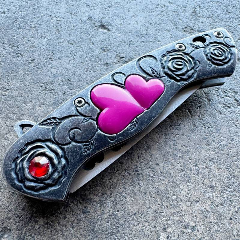Featuring a striking combination of a silver blade, 440 stainless coated steel and an eye-catching pink heart design, the Falcon 7" Overall in Length Black Handle is the perfect tool for your daily adventures. Whether you need to conquer tough materials, or simply carry it as a fashion statement, its built-in belt clip and perfectly balanced handle make it your go-to companion. What are you waiting for? Get ready to take on the day with the Falcon.