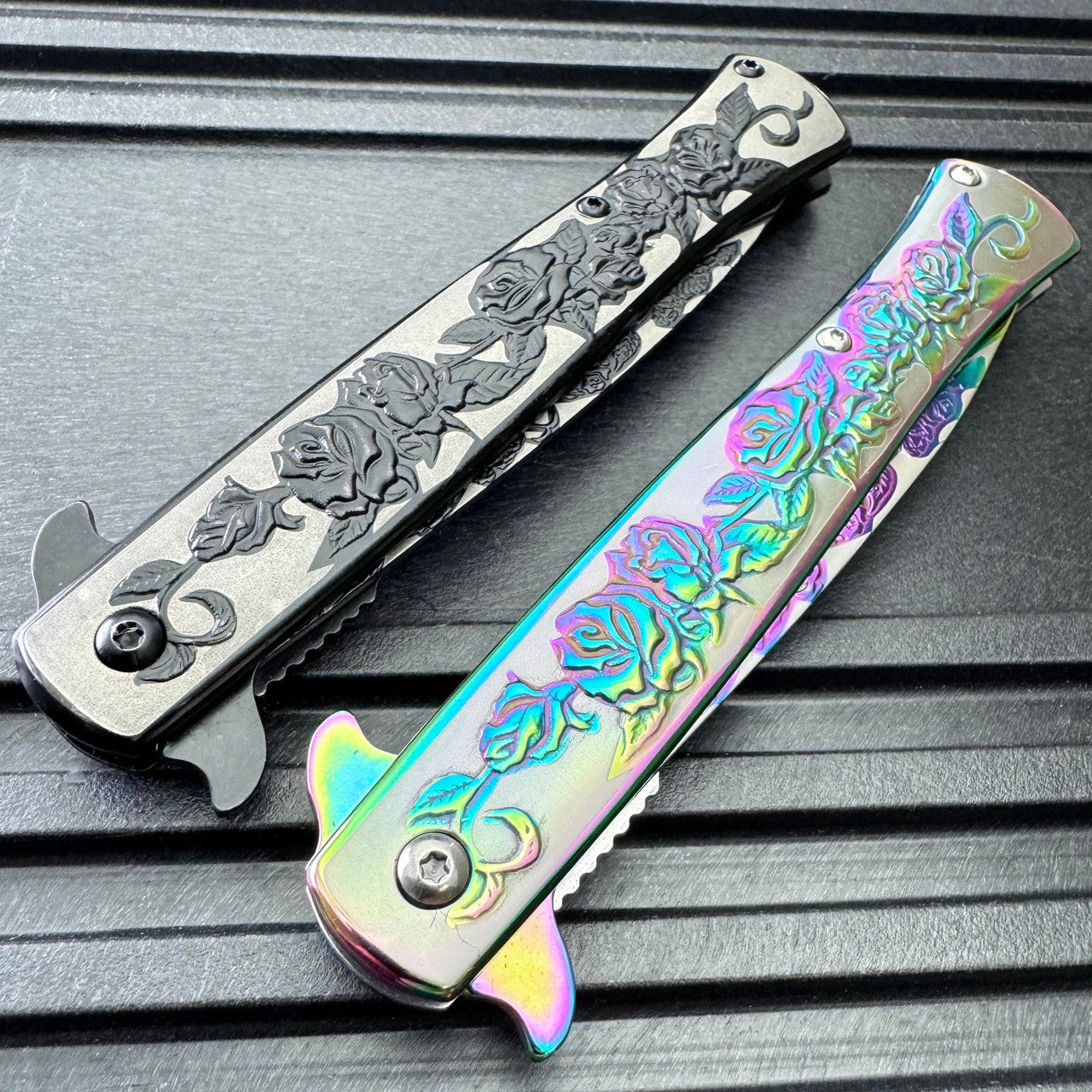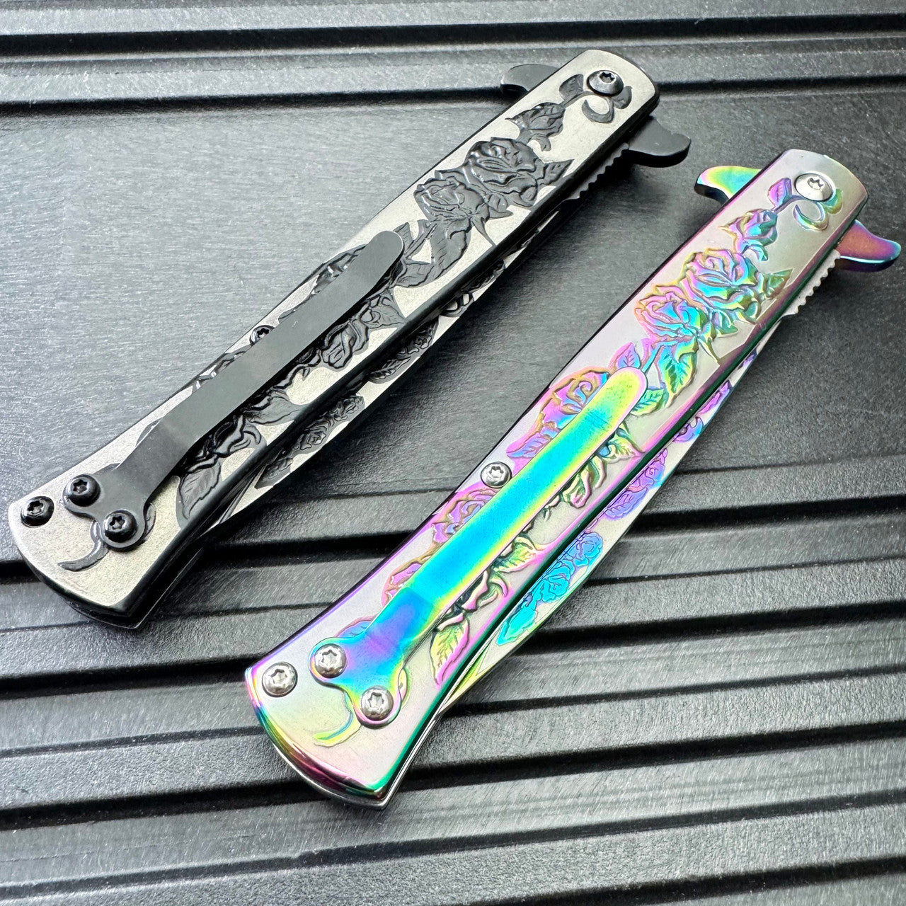 As an expert in the field, I introduce to you our 4" Rose Blade Assisted Knife. Crafted with a rose handle and 440 stainless steel, this spring-assisted pocket knife boasts a 4" blade and 8" overall length. Complete with a belt clip, it offers both style and functionality.